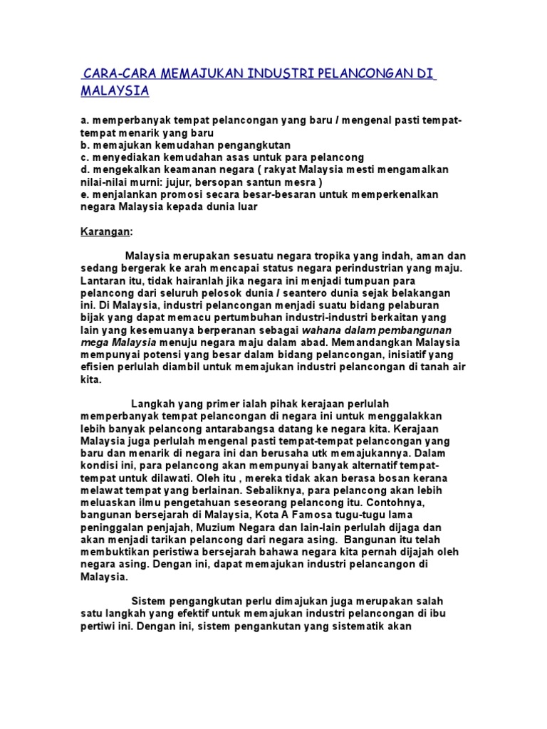 10 Cara Promosi Website agar Banyak Pengunjung 1. Contoh Karangan Pelancongan PT3. Pelancongan adalah industri ketiga terpenting negara selepas pembuatan dan komoditi.